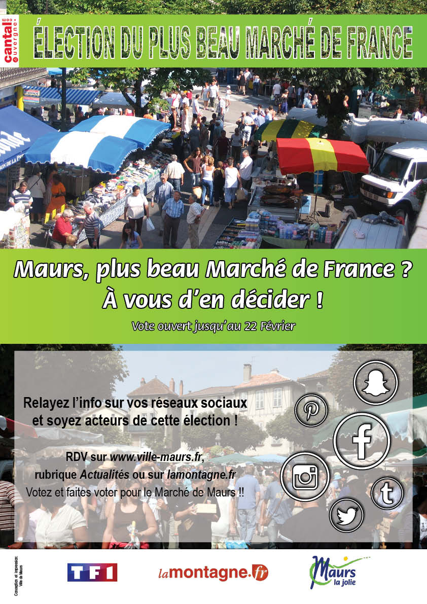 Il ne vous reste plus beaucoup de temps pour faire pencher la balance en faveur de votre marché préféré. Vous avez jusqu’au 22 Février pour voter et faire voter pour le Marché de la Petite Nice du Cantal. Plus que jamais, votre soutien est capital pour faire de Maurs et son Marché le plus beau Marché d’Auvergne et de tenter sa chance au niveau national !