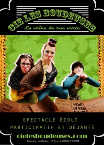 Avec leur spectacle écologique et déjanté ‘’La Criée de la rue Verte’’, la Compagnie Les Boudeuses livrera tous ses secrets pour un entraînement loufoque et décalé aux pratiques éco-citoyennes. Face à la pollution, aux gaz à effets de serre et autres émissions, c’est sur un ton sarcastique, engagé et décalé que les Boudeuses entraîneront le public à consommer moins pour vivre mieux !