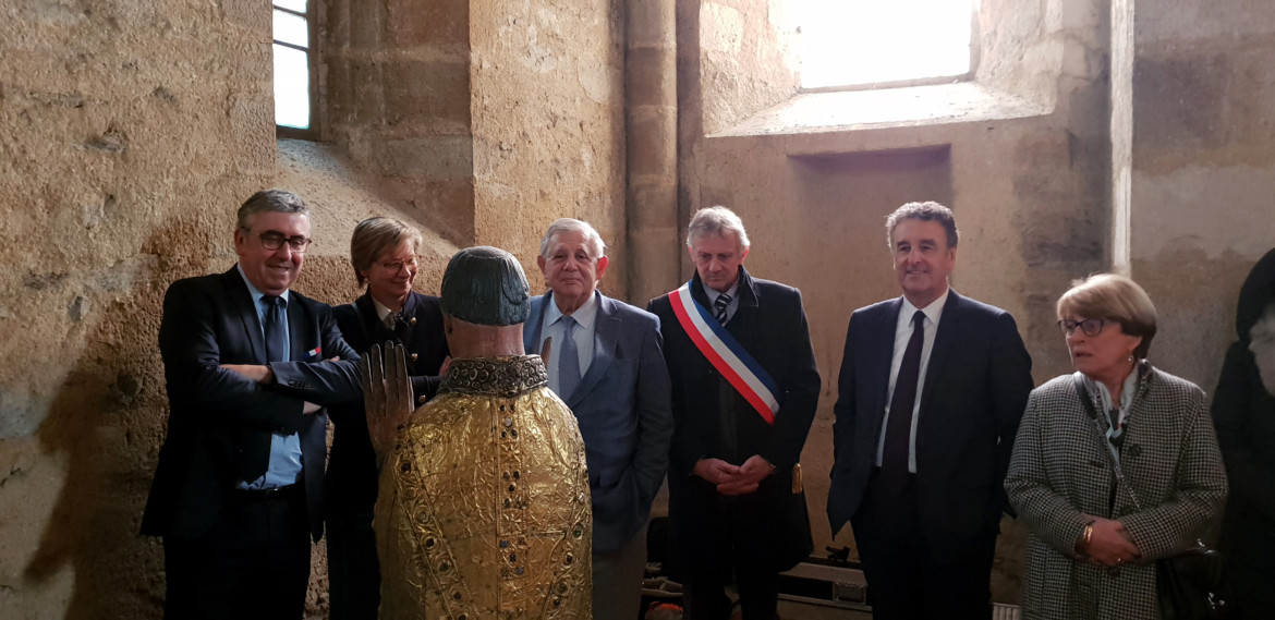 Les invités de l’inauguration de la Mairie de Maurs ont fait un détour vers l’Abbatiale pour profiter de cette sortie rare de la relique. Ils ont ainsi pu admirer au plus près ce buste orfévré, joyaux de l’art roman français, sous les explications historiques de Mme Breuil du Conseil départemental.