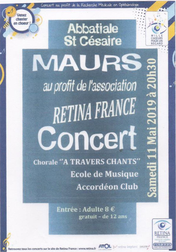 Samedi 11 Mai à 20 h 30, l’Abbatiale St Césaire de Maurs accueillera un concert au profit de l’association Retina France. A cette occasion la chorale « A TRAVERS CHANTS  » l’accordéon club de La Châtaigneraie et l’école de musique intercommunale se produiront afin de récolter des fonds pour la recherche pour les maladies liées à la vue.