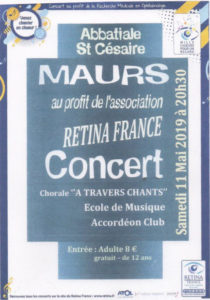 Samedi 11 Mai à 20 h 30, l’Abbatiale St Césaire de Maurs accueillera un concert au profit de l’association Retina France. A cette occasion la chorale « A TRAVERS CHANTS » l’accordéon club de La Châtaigneraie et l’école de musique intercommunale se produiront afin de récolter des fonds pour la recherche pour les maladies liées à la vue.