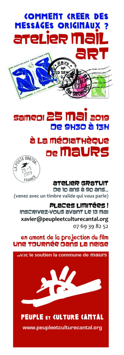 Samedi 25 Mai, l’Association Peuple et Culture Cantal propose une journée autour de La Poste ! A cette occasion, un atelier « Mail Art » sera organisé à la Médiathèque Municipale de Maurs de 9h30 à 13h sur participation libre. Dans la suite de ce projet, la bibliothécaire Valérie Géraud propose au CM1 et CM2 de l’Ecole Publique Denis Forestier un travail autour de l’art postal lors des TAP.