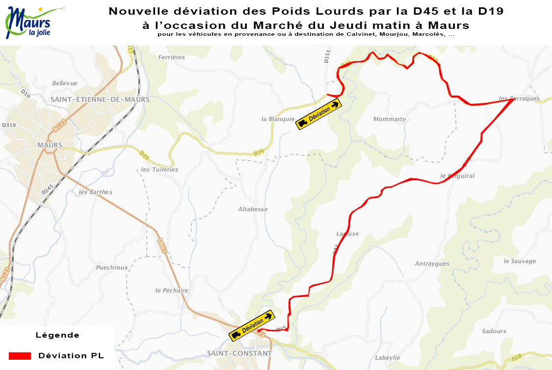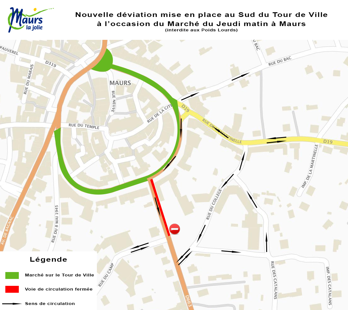 En concertation avec les services routiers du Conseil départemental et de la Gendarmerie du Cantal, la commune de Maurs installera désormais une nouvelle déviation au Sud du Tour du Ville à l’occasion du Marché du Jeudi matin.