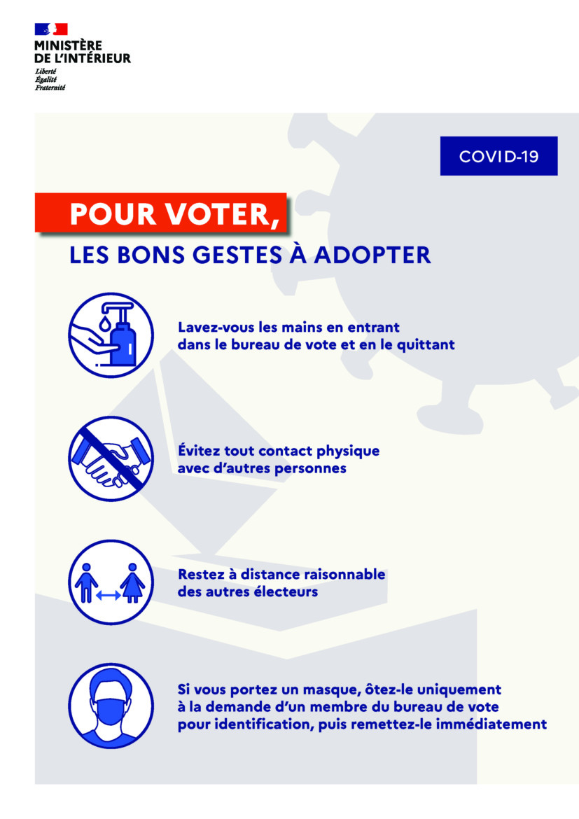 • que des distributeurs de gel hydroalcoolique seront à disposition des votants à l’entrée et à la sortie du bureau de vote ;