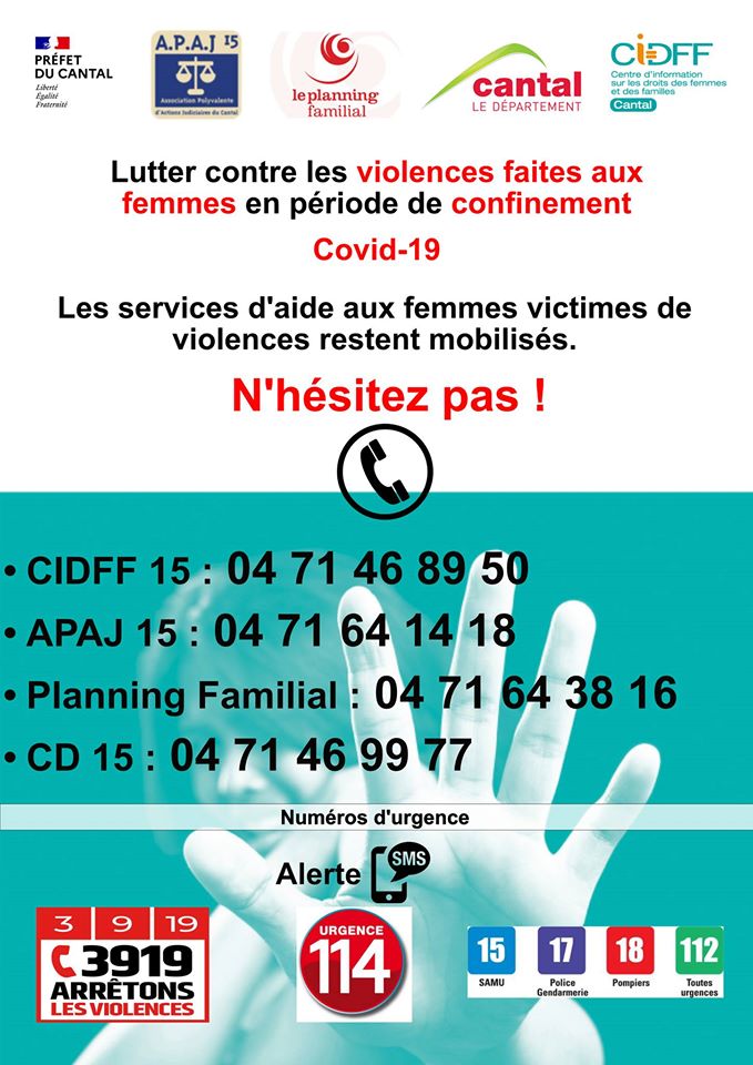 Les associations locales de lutte contre les violences et d’aide aux victimes, et le Conseil départemental du Cantal s’adaptent et assurent des permanences téléphoniques ou proposent de laisser un message électronique pour être rappelées. Une affiche rappelle ces points de contacts. Les réseaux de diffusion de la chambre de commerce et d’industrie et de la chambre des métiers vont être sollicités pour diffuser cette affiche.