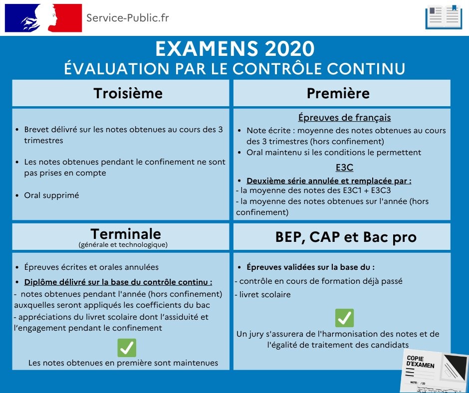 En raison du contexte sanitaire et du confinement, l’ensemble des épreuves du diplôme national du brevet et du baccalauréat général, technologique et professionnel seront validées à partir des notes du livret scolaire. Les diplômes seront délivrés uniquement par le contrôle continu. Seule l’épreuve orale du baccalauréat de français est maintenue.