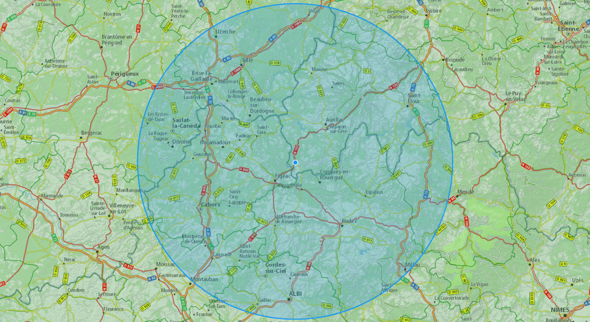 Pour information, voici le rayon de 100 km depuis le Centre-Ville de Maurs :