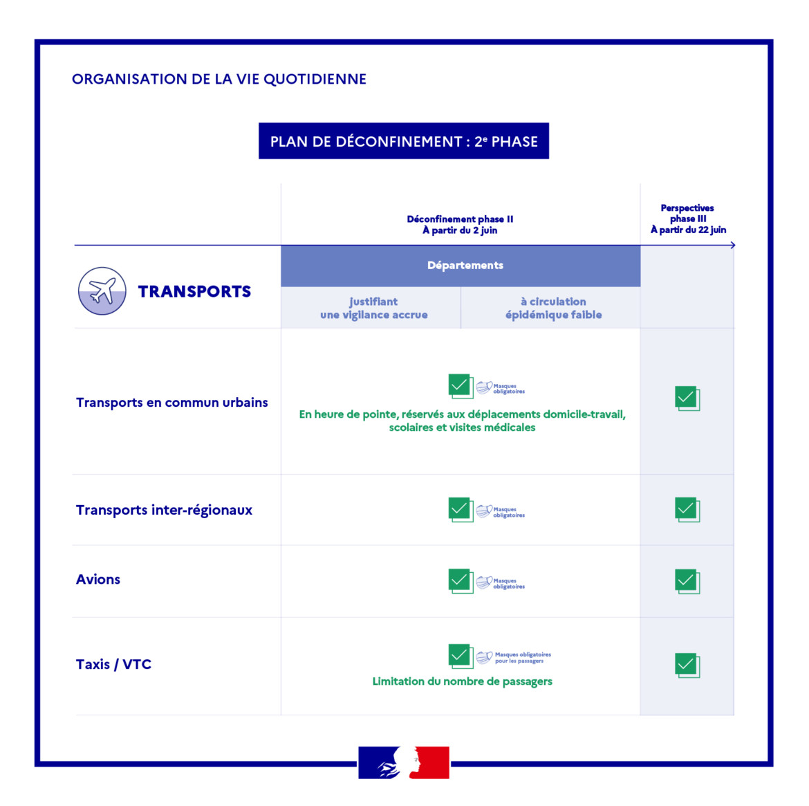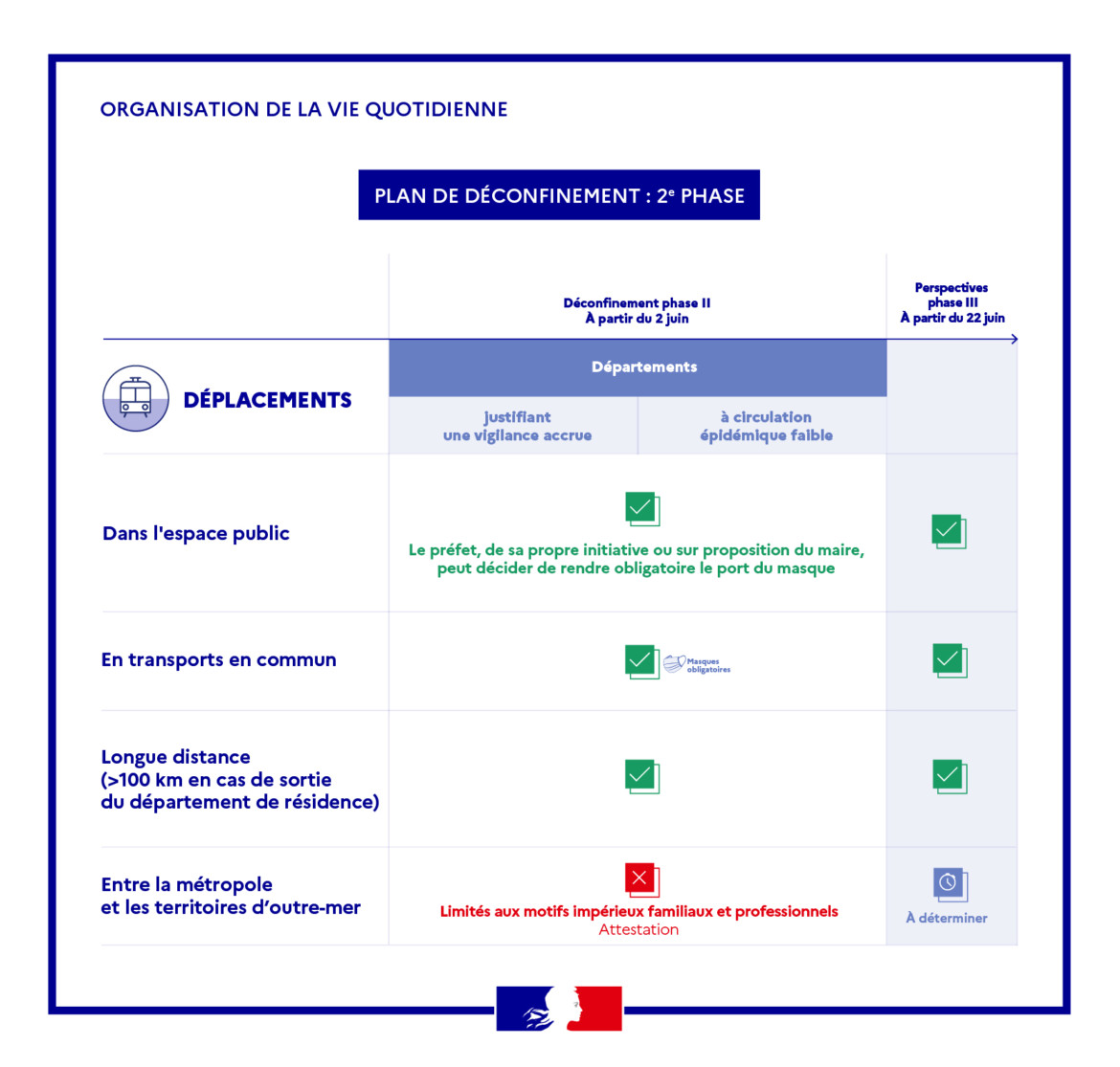 Cette phase 2 du déconfinement prévoit un large assouplissement des règles. En particulier, les restrictions de circulation à travers le territoire métropolitain (règle des 100 kilomètres) sont abrogées et tous les Françoais pourront se déplacer sur le territoire sans limite de distance mais en respectant toujours les consignes sanitaires.