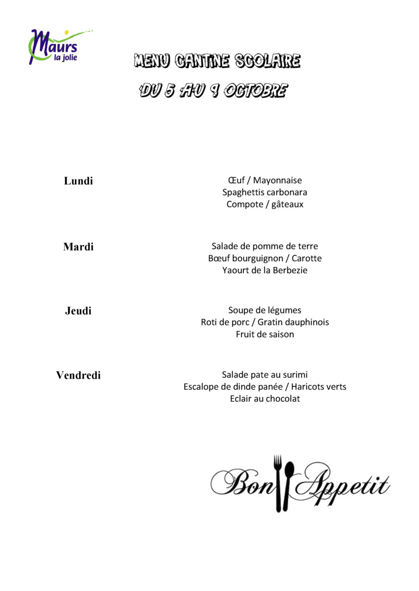 Consultez les menus du 05 au 09 Octobre 2020