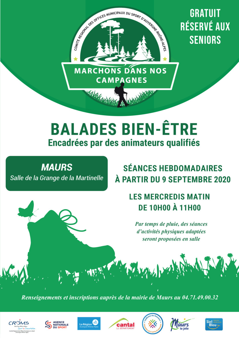 Le Comité Régional des Offices Municipaux du Sport (CROMS) d’Auvergne-Rhône-Alpes a décidé, avec les éducateurs qui interviennent sur Maurs, de reprendre l’action Marchons dans nos campagnes, sous une forme différentes jusqu’aux vacances de Noël. Ces ballades bien-être se déroulent chaque Mercredi matin et les marcheurs se retrouvent à la salle municipal La Martinelle.