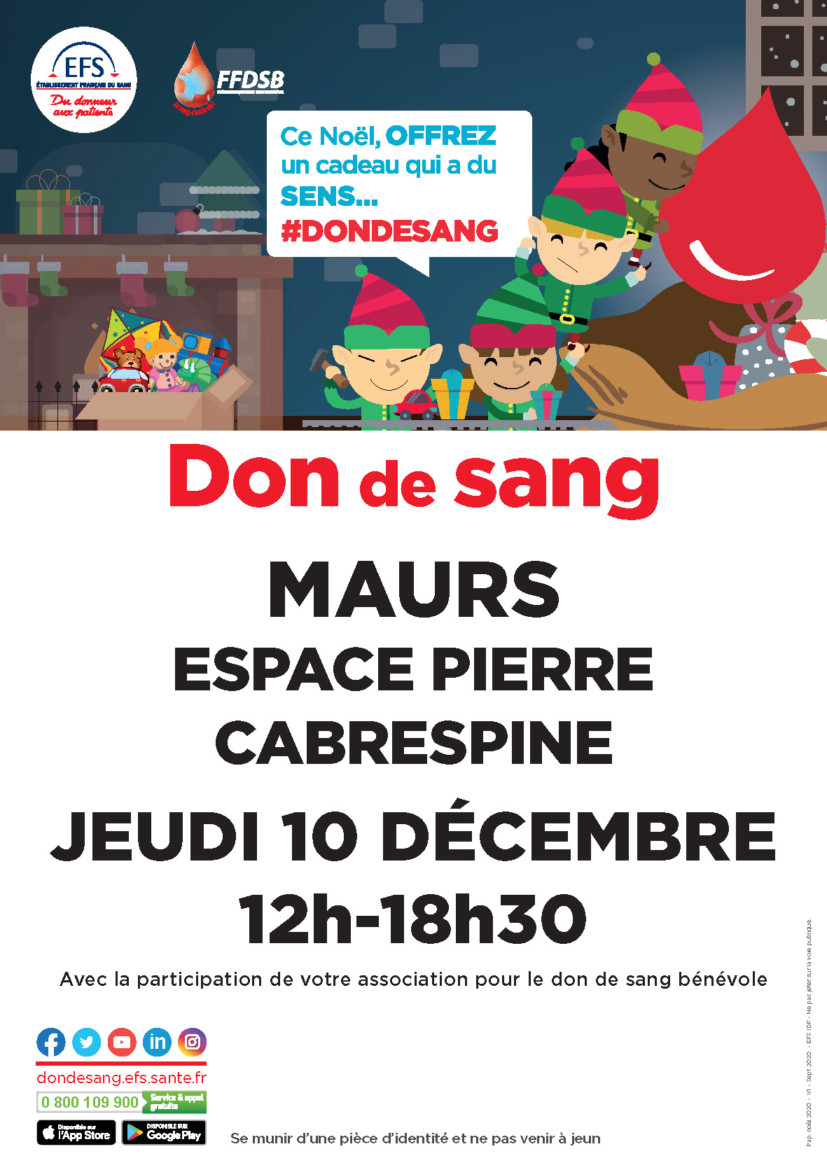 Demain, Jeudi 10 Décembre, l’Etablissement Français du Sang, l’UD 15 – Don de Sang Bénévole et l’association des bénévoles de Maurs organisent une collecte de Don de Sang de 12h à 18h30, à l’espace Pierre Cabrespine.