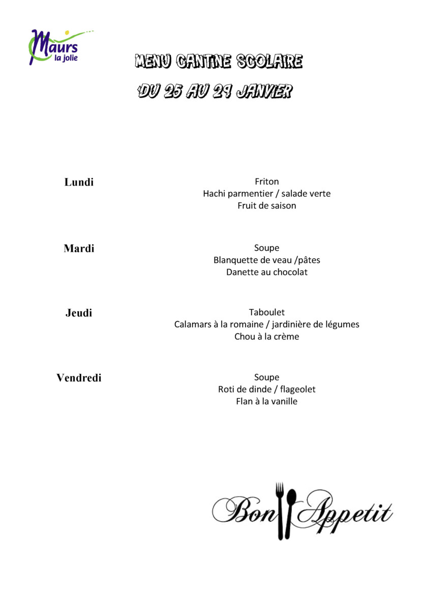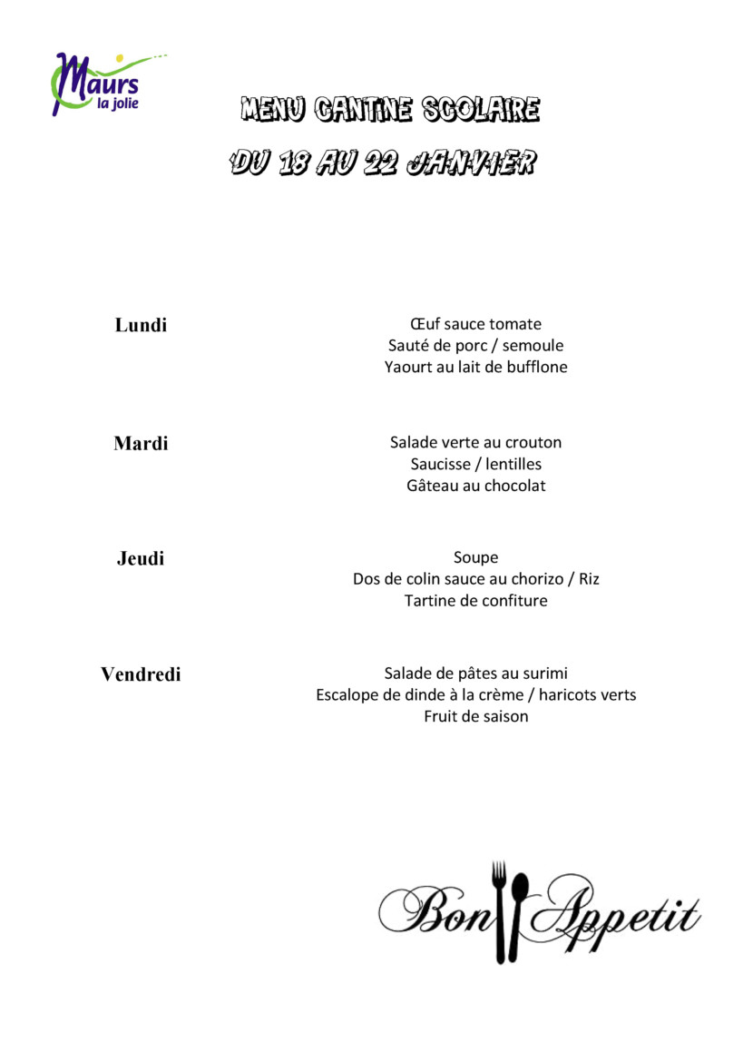 Menus du 18/01 au 29/01 à l’Ecole Denis Forestier