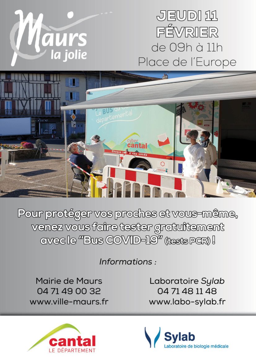 Le « Bus COVID-19 » revient à Maurs ce Jeudi 11 Février 2021, de 09h à 11h, place de l’Europe. Le laboratoire Sylab proposera ainsi de prélever sans rendez-vous préalable toute personne se présentant au bus.