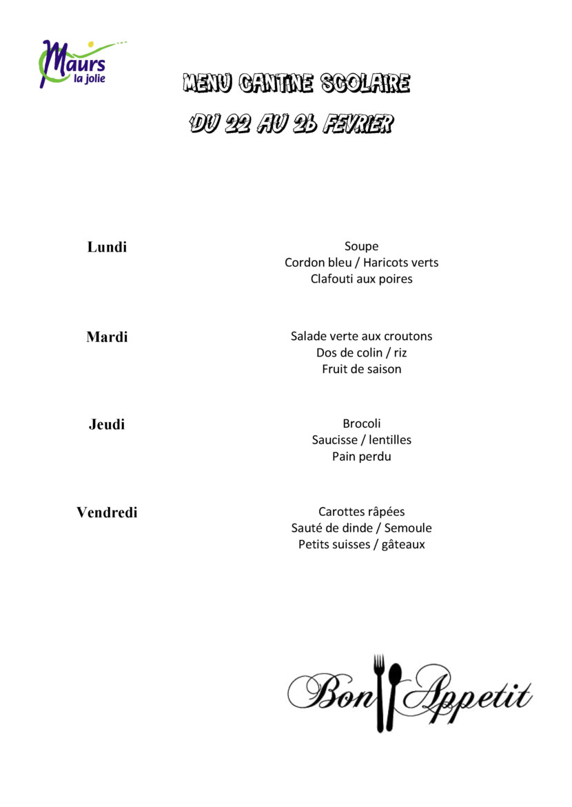 Consultez les menus du 22 Février au 05 Mars 2021