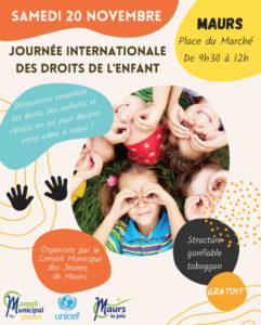 A l’occasion du 32ème anniversaire de la Convention des Droits de l’Enfant, le Conseil Municipal Jeunes de Maurs organise une matinée pour découvrir, échanger et célébrer les droits des enfants, ce Samedi 20 Novembre, de 9h30 à 12h, place du Marché !