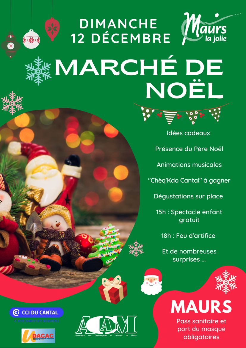 Organisé par la Mairie en collaboration avec l’Association des Commerçants et Artisans du Pays de Maurs (ACAM), le Marché de Noël accueillera près d’une quarantaine de stands proposant à la vente de bons produits locaux, des créations originales, … Le Père Noël viendra faire un tour du côté de la ‘’Petite Nice du Cantal’’ (de 10h à 12h et de 14h à 17h) et petits comme grands pourront repartir avec une photo souvenir avec lui !