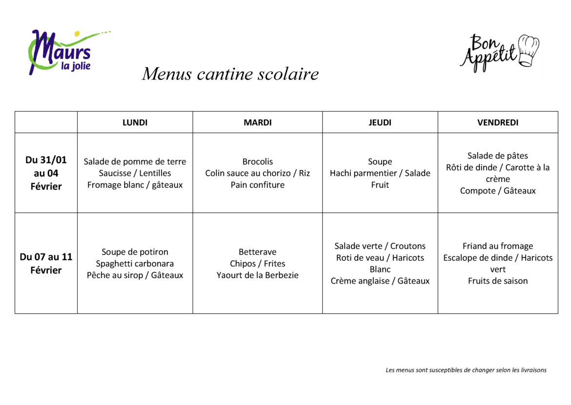 Consultez les menus du 31 Janvier au 11 Février 2022