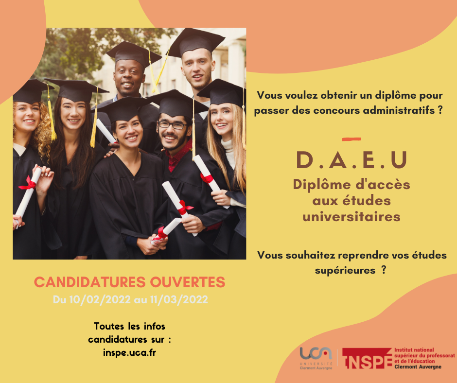 L’INSPÉ Clermont Auvergne informe que le DAEU (Diplôme d’Accès aux Études Universitaires) ouvre ses portes aux candidats pour la rentrée 2022 !