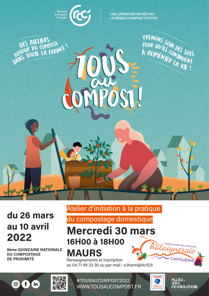 La Communauté de Communes de la Châtaigneraie Cantalienne, adhérente au Réseau Compost Citoyen, organise dans le cadre de l’évènement annuel national : Tous au compost des ateliers d’initiation à la pratique du compostage domestique. Emilie LHERM qui est en charge de la gestion de proximité des biodéchets à la Communauté de Communes, viendra à votre rencontre le mercredi 30 avril de 16h à 18h au pôle de Maurs. Pour permettre de vous accueillir dans les meilleures conditions, merci de vous inscrire 72 heures avant, à l’atelier de votre choix, par mail (e.lherm@4c15.fr) ou par téléphone (04 71 49 33 30).