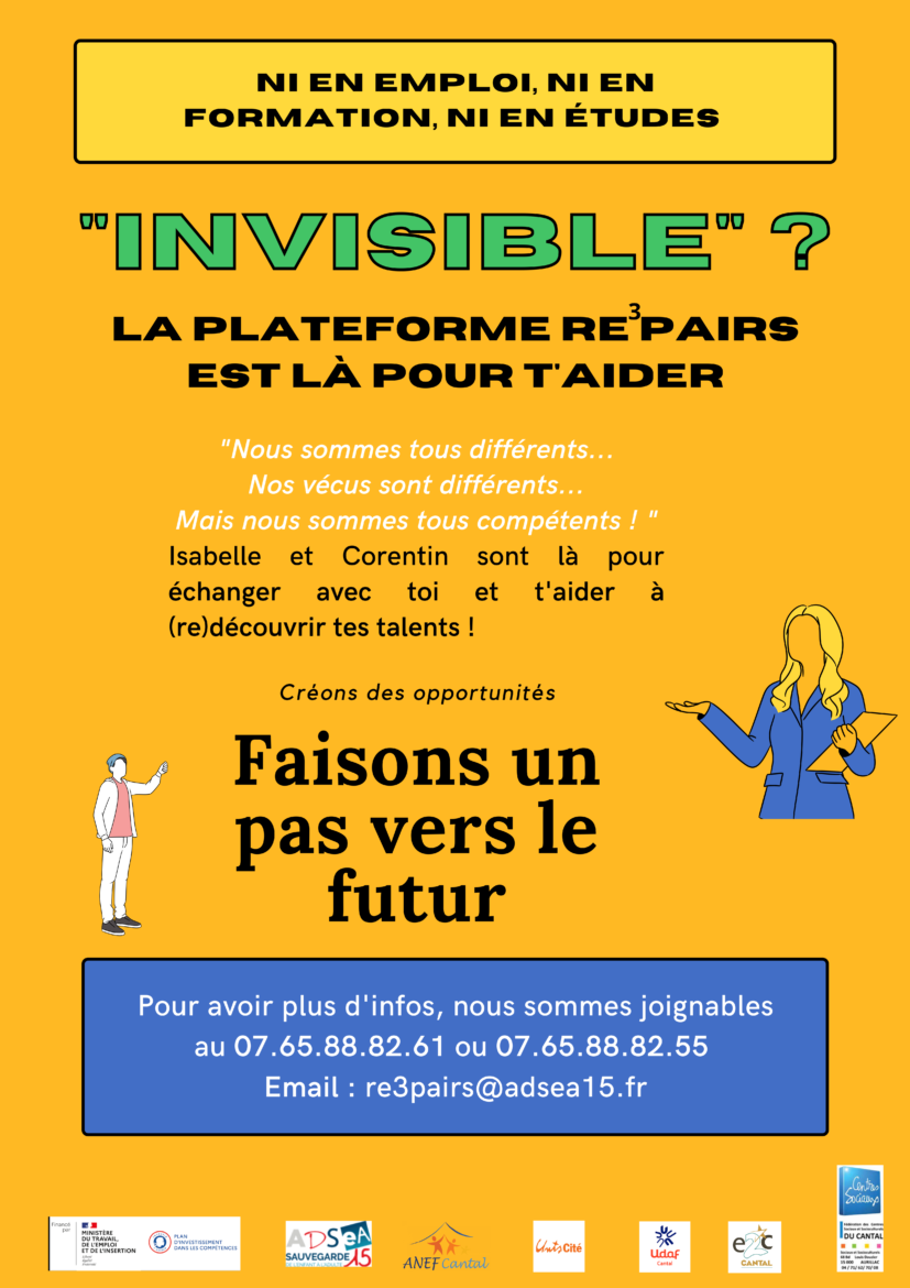 L’ADSEA du Cantal a répondu à un appel à projet pour des jeunes âgés de 16 à 30 ans (mais nous pouvons aller au-delà de 30 ans) se trouvant en rupture de parcours scolaire et/ou professionnel. L’ADSEA du Cantal et ses nombreux partenaires ont créé ainsi la Plateforme Re³pairs.