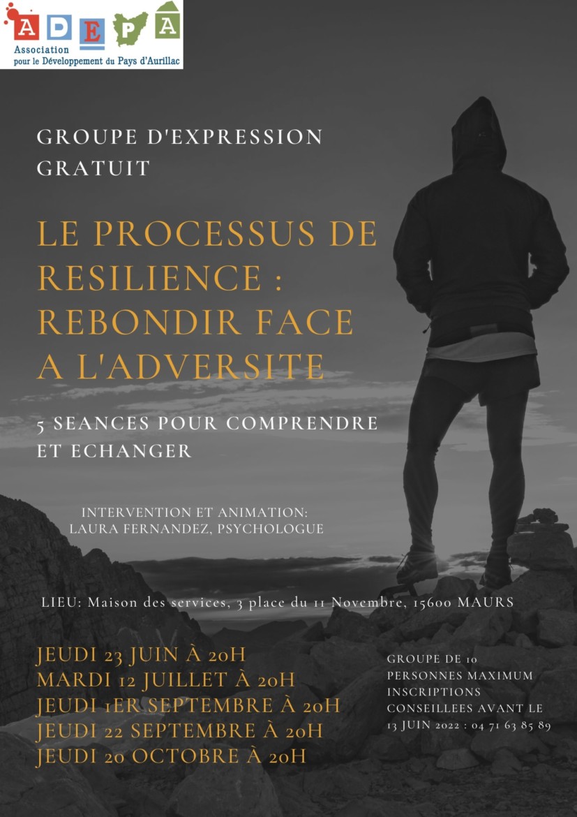 C’est la raison pour laquelle l’Association pour le Développement du Pays d’Aurillac, dans le cadre du Contrat Local de Santé, propose un groupe d’expression sur la Résilience, à la Maison des services de Maurs, animé par Laura Fernandez, psychologue (présentation d’éléments théoriques/de réflexion en première partie, puis échange avec les participants en deuxième partie).