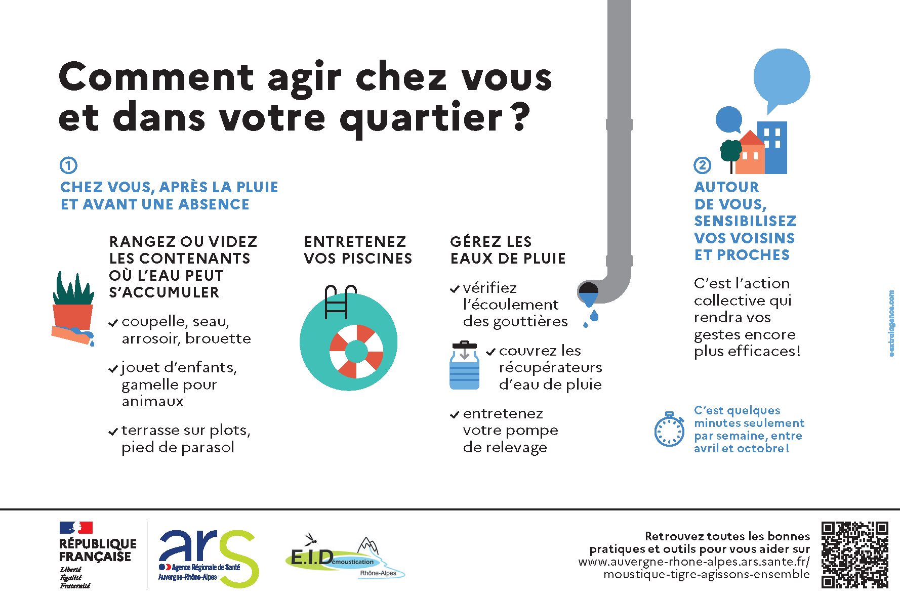 Présent depuis 2012 en Auvergne-Rhône-Alpes, le moustique tigre s’est installé progressivement dans 10 des 12 départements de la région dont le Cantal. Pour limiter ces nuisances, 3 recommandations simples et essentielles : ranger, vider et couvrir tous les contenants dans lesquels l’eau s’accumule !