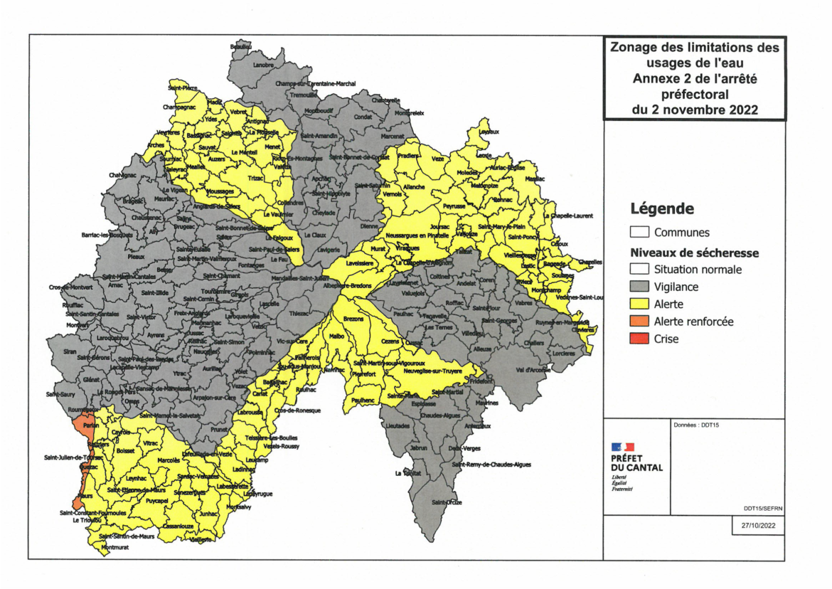 Le 2 Novembre 2022, le Préfet du Cantal a pris un nouvel arrêté limitant provisoirement les usages de l’eau dans le département !