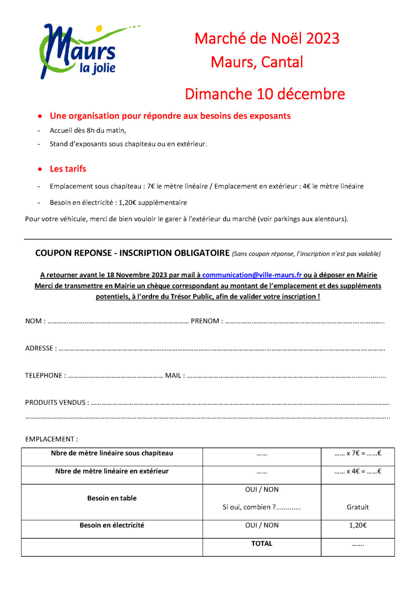 Si vous souhaitez vous inscrire en tant qu’exposant pour tenir un stand lors du Marché de Noël, merci de renvoyer ce bulletin d’inscription d’ici le 18 novembre à communication@ville-maurs.fr.
