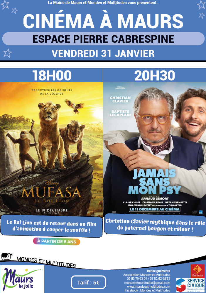 > Du 13 au 26 décembre dernier, les maursois ont voté sur l’application Intramuros et sur papier à l’accueil de la Mairie pour choisir les films qui seront projetés lors de la prochaine séance de cinéma qui se déroulera le 31 janvier 2025 à l’Espace Pierre Cabrespine (5€ par film / Sans réservation). Merci à tous pour votre participation !