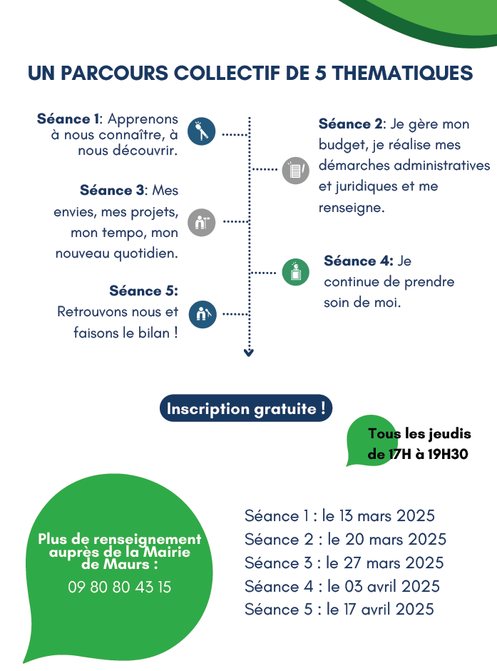 Les ateliers, animés par des professionnels experts se dérouleront à la salle Le Veyre de la Mairie de Maurs les jeudis suivants, de 17h à 19h30 :