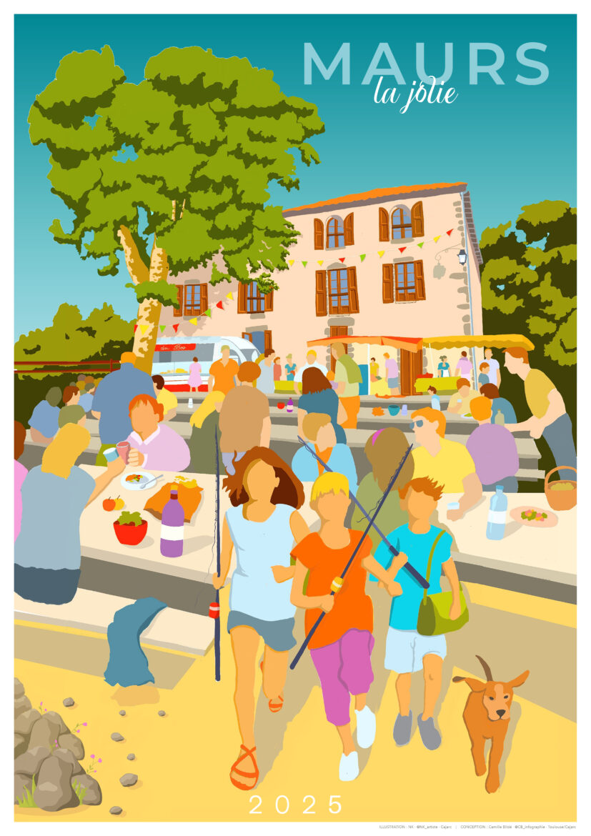 Après la Fontaine de la République en 2023, puis la Grande Fontaine en 2024, c’est au Moulin du Fau d’être mis à l’honneur par l’artiste cajarcoise NK ! Cette illustration, qui représente une scène estivale au Domaine du Fau, met en avant un marché de pays animé, des amis réunis autour des tables et des enfants partant à la pêche. Elle capture parfaitement l’ambiance familiale qui caractérise ce lieu champêtre emblématique de Maurs.