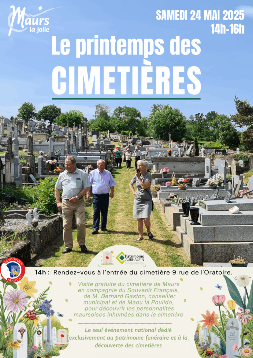 🌟Dans le cadre du printemps des cimetières, rendez-vous samedi 24 mai 2025 à partir de 14h au cimetière de Maurs en compagnie du Souvenir Français, de M. Bernard Gaston, conseiller municipal et de Maou la Poulido pour une visite guidée gratuite et y découvrir les personnalités maursoises inhumées.