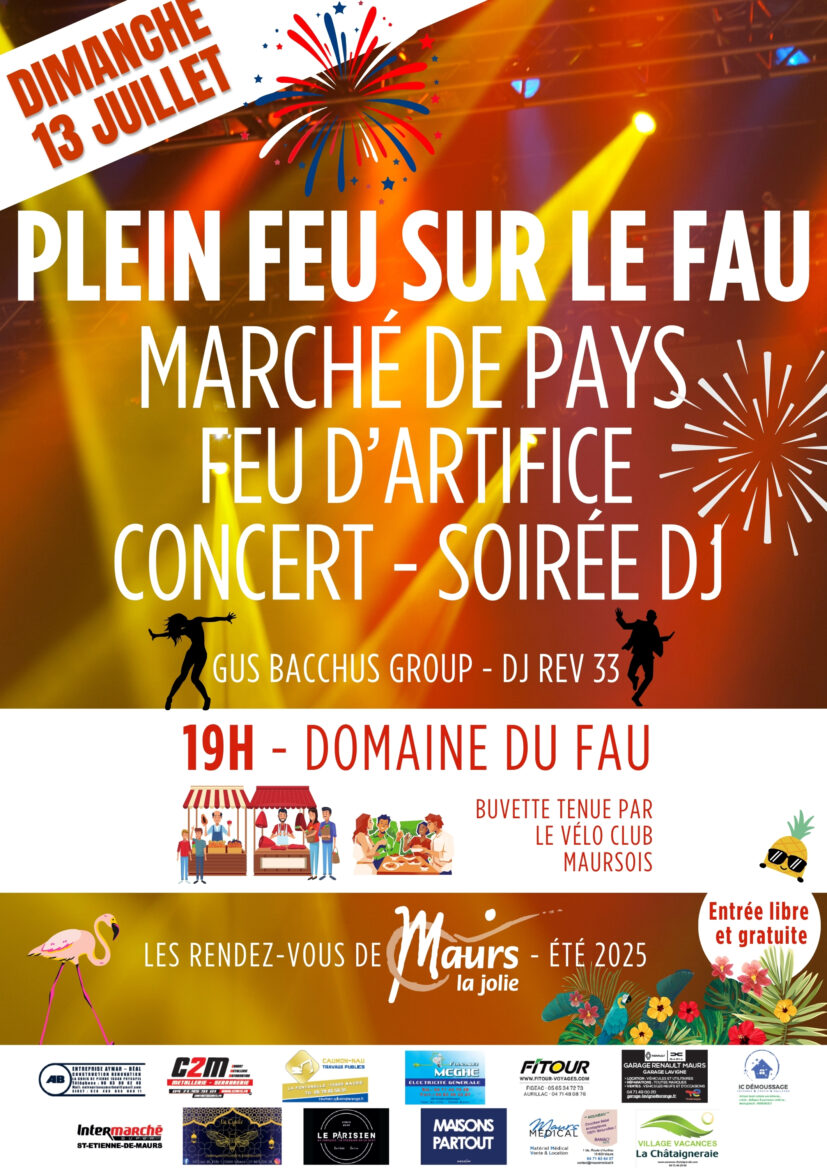 Ne manquez pas la soirée incontournable organisée par la municipalité « Plein feu sur le Fau » le samedi 13 juillet au Domaine du Fau !
