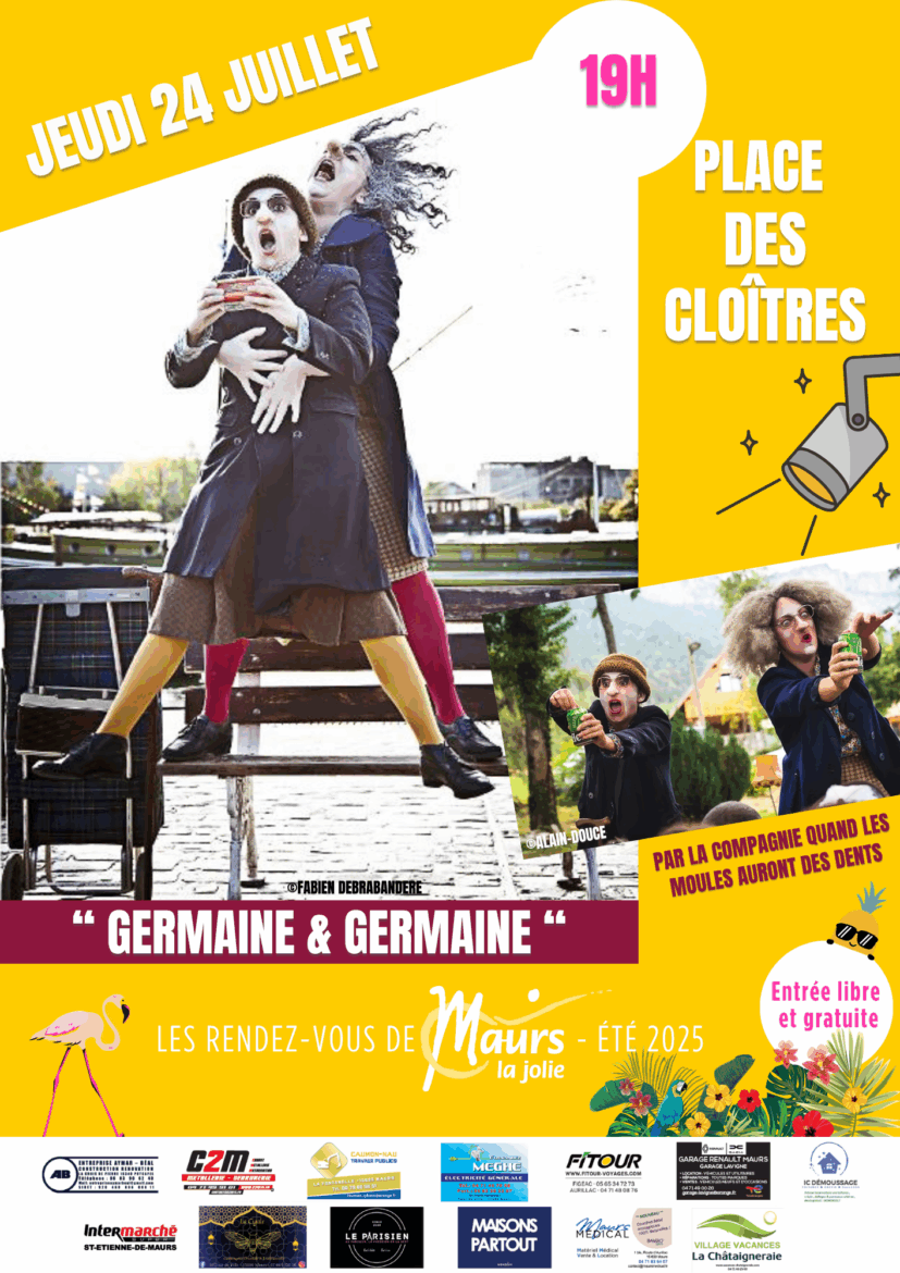 Dans le cadre des Rendez-vous de Maurs, la compagnie Quand les moules auront des dents présentera « Germaine & Germaine », son spectacle pour petits et grands Place des Cloîtres le jeudi 24 juillet à 19h !